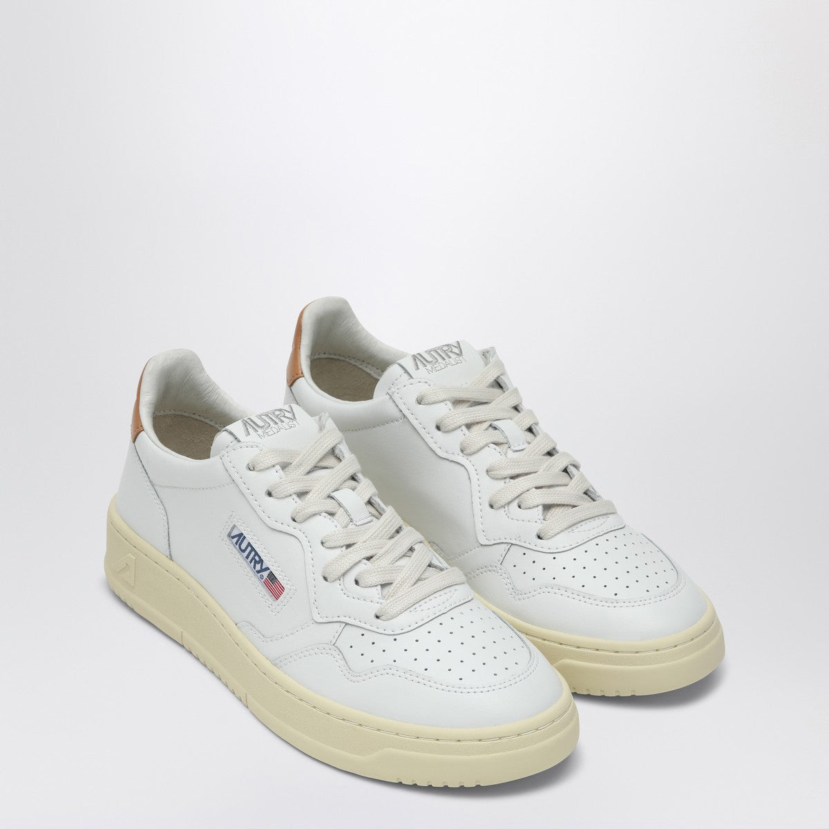 Sneaker Medalist low top by Autry in white leather, characterized by a perforated toe, front lace-up closure, leather tongue with a stitched label in tone, padded collar, sand-coloured heel tab with embossed logo, leather and cotton sponge lining, and cream rubber sole.