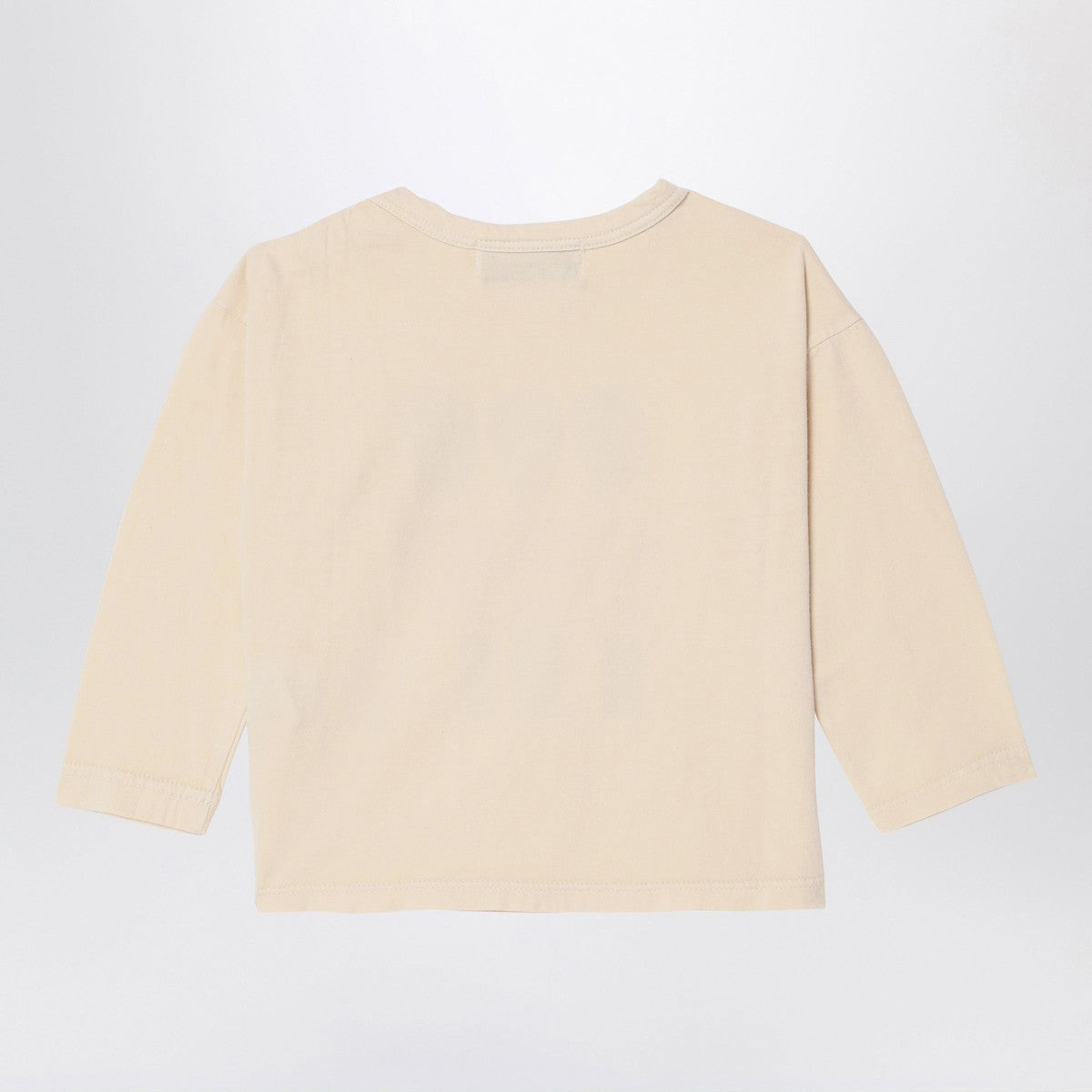 Ivory organic cotton crew-neck T-shirt from Bobo Choses featuring long sleeves, shoulder buttons, print on front and straight hem.