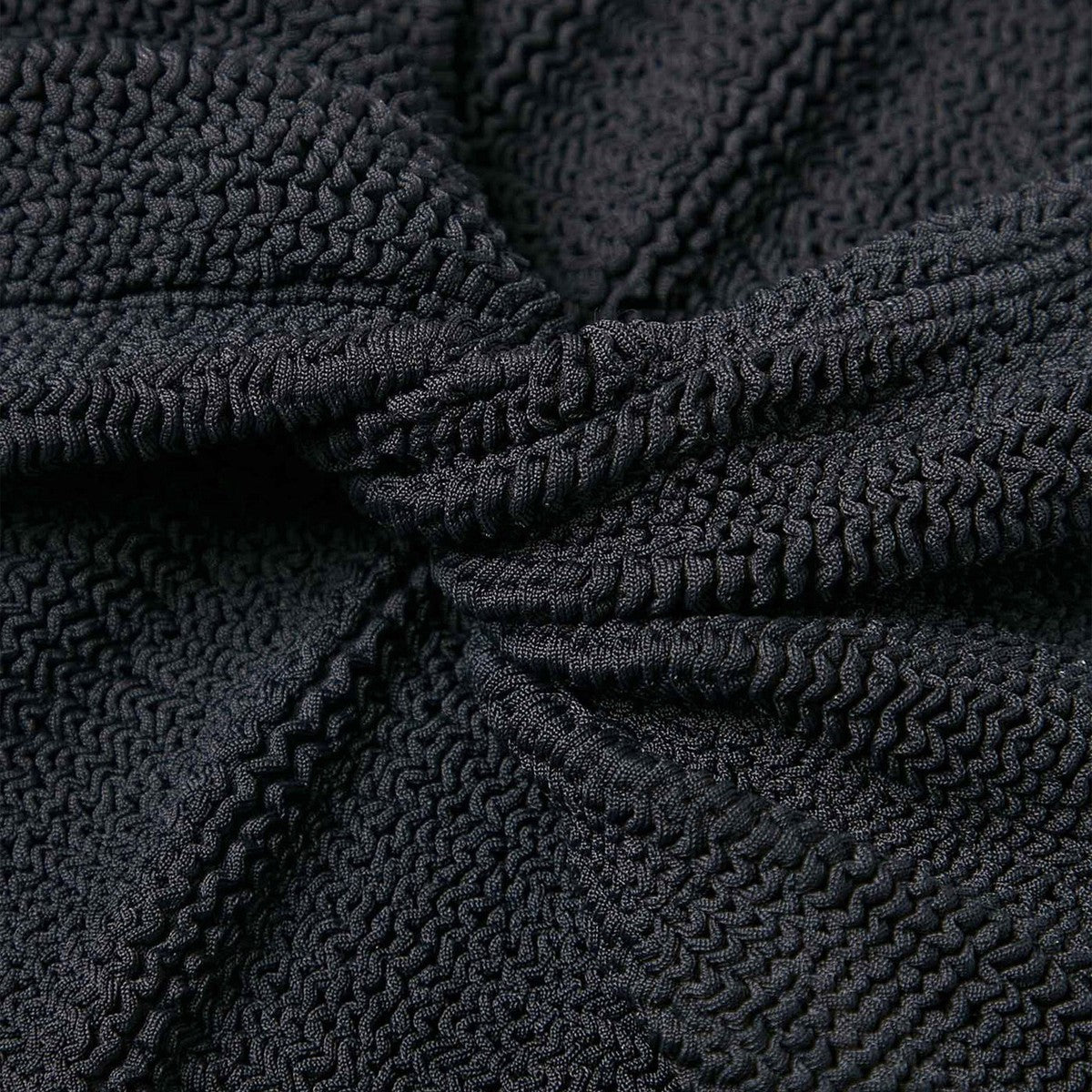 Two-piece bikini by Hunza G in nylon with Original Crinkle processing in black, characterized by a bra with flat straps and a crossed detail on the front and a one-size design.