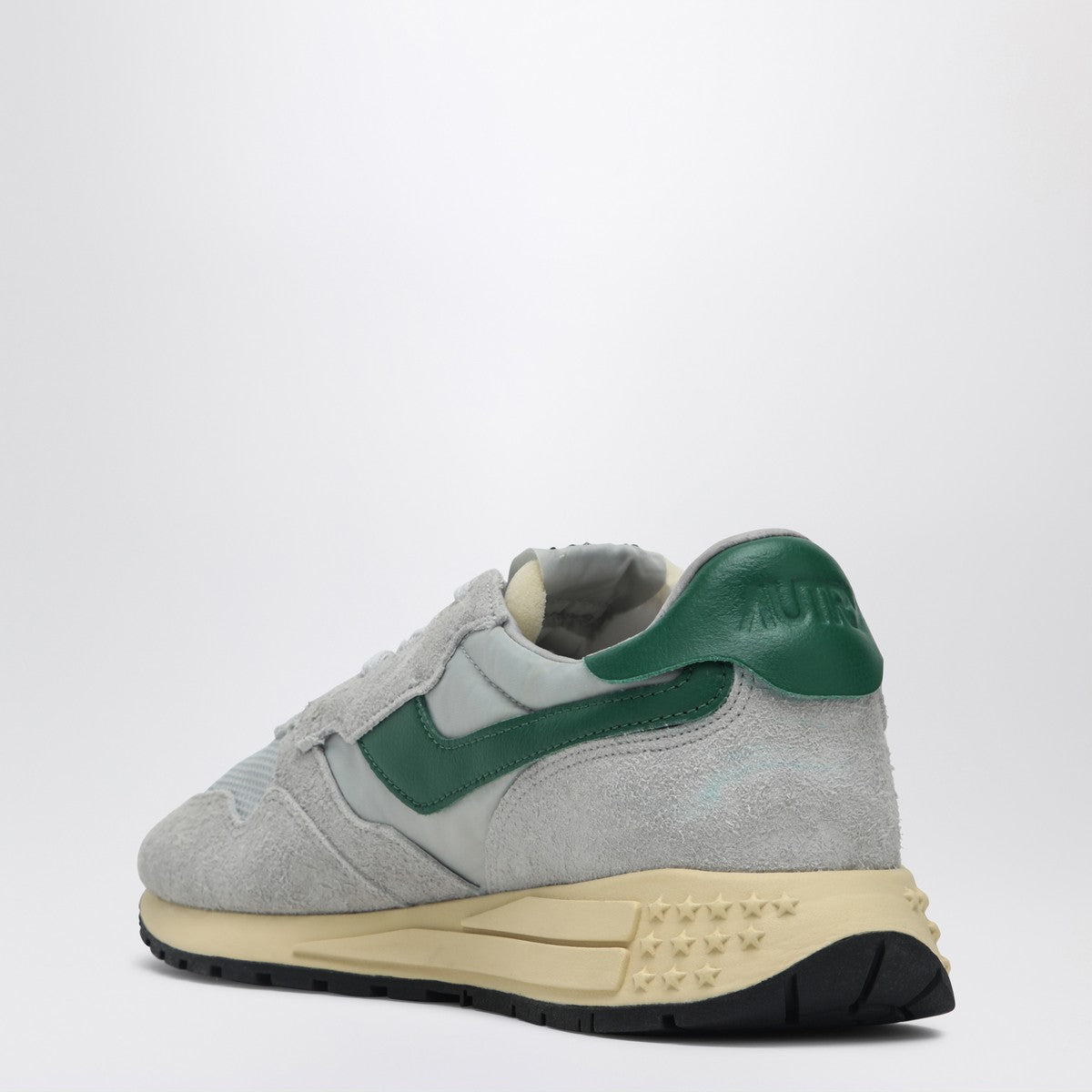 Low-top sneaker by Autry in gray suede and nylon, characterized by green leather details, perforated toe, lace-up closure, padded collar, suede details, logo detail on the sides, tongue with logo patch, and rubber sole.