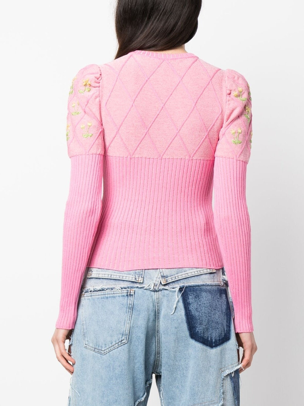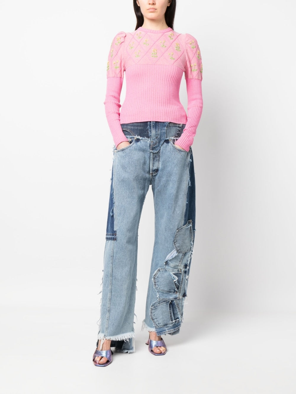 بلوزة محبوكة بأكمام طويلة من كورميو، تتميز بلون وردي الفلامنجو، ومزيج من القطن، وهيكلها المحبوك، وتصميمها المرن، و تطريزها الزهري، ورقبتها المستديرة، وأكمامها الطويلة، وحافة مستقيمة. تيشيرت قطني مطرز بالترتر. المقاس والملاءمة - هذا القطعة تناسب المقاس الحقيقي. نوصي بالحصول على مقاسك المعتاد. طول الطراز 1.75 متر / 5 أقدام و 8 بوصات ويرتدي مقاس 40 (إيطالي).