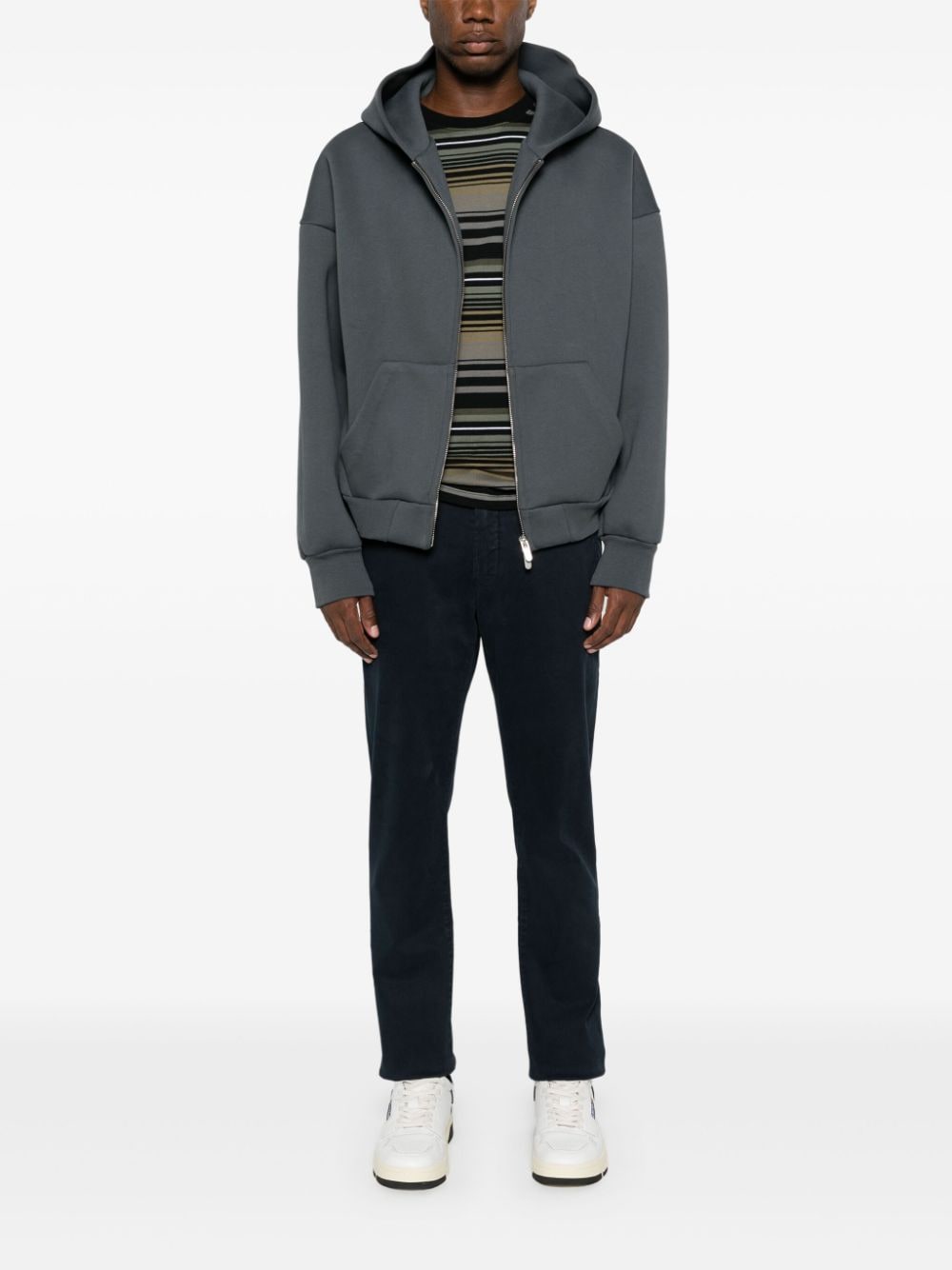 بنطلون ضيق، لون أزرق بحري داكن، نسيج تويل، مصبوغ، أزرار تحمل شعار العلامة، حلقات خصر منخفضة، جيب صغير للمحافظ، جيبان جانبيين، جيبان خلفيان بزرين، لوحة تحمل شعار العلامة، سحاب مخفي وإغلاق بزر، مقاس ضيق. المقاس والطول - هذا المنتج يناسب المقاس الحقيقي. نوصي بالحصول على مقاسك المعتاد. الطول 1.84 متر / 6 أقدام و 1 بوصة ويرتدي مقاس 32 (محيط الخصر سم).